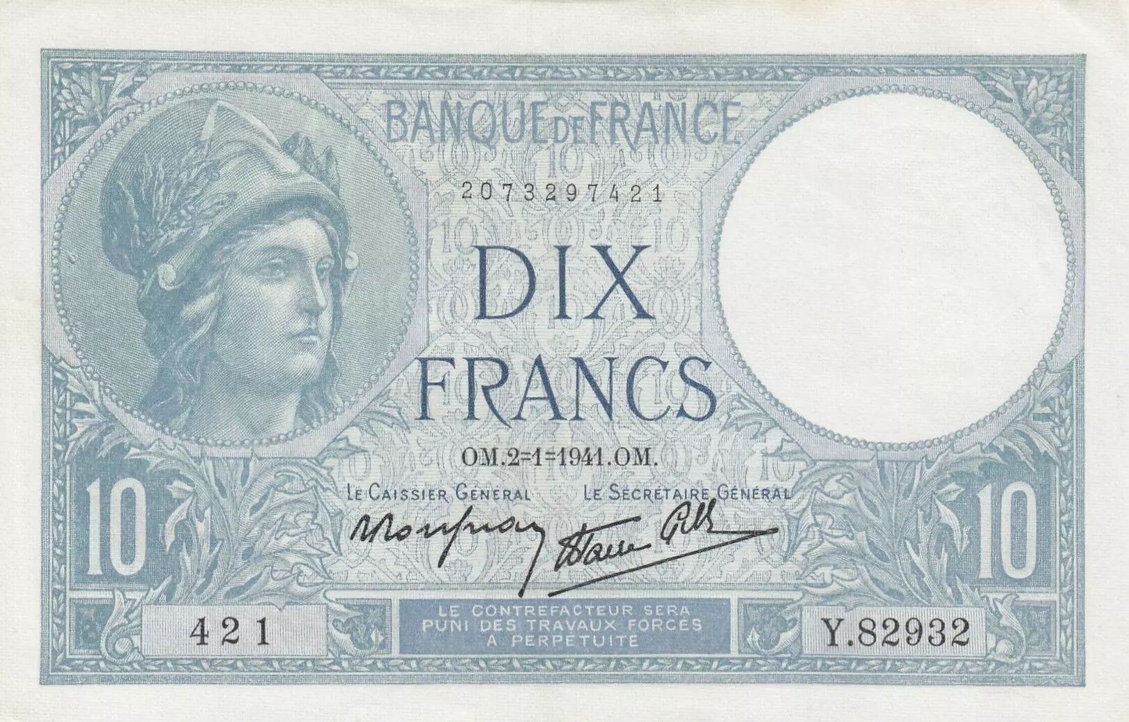 Billet France 10 Francs - Minerve - 02-01-1941 - Série Y.82932