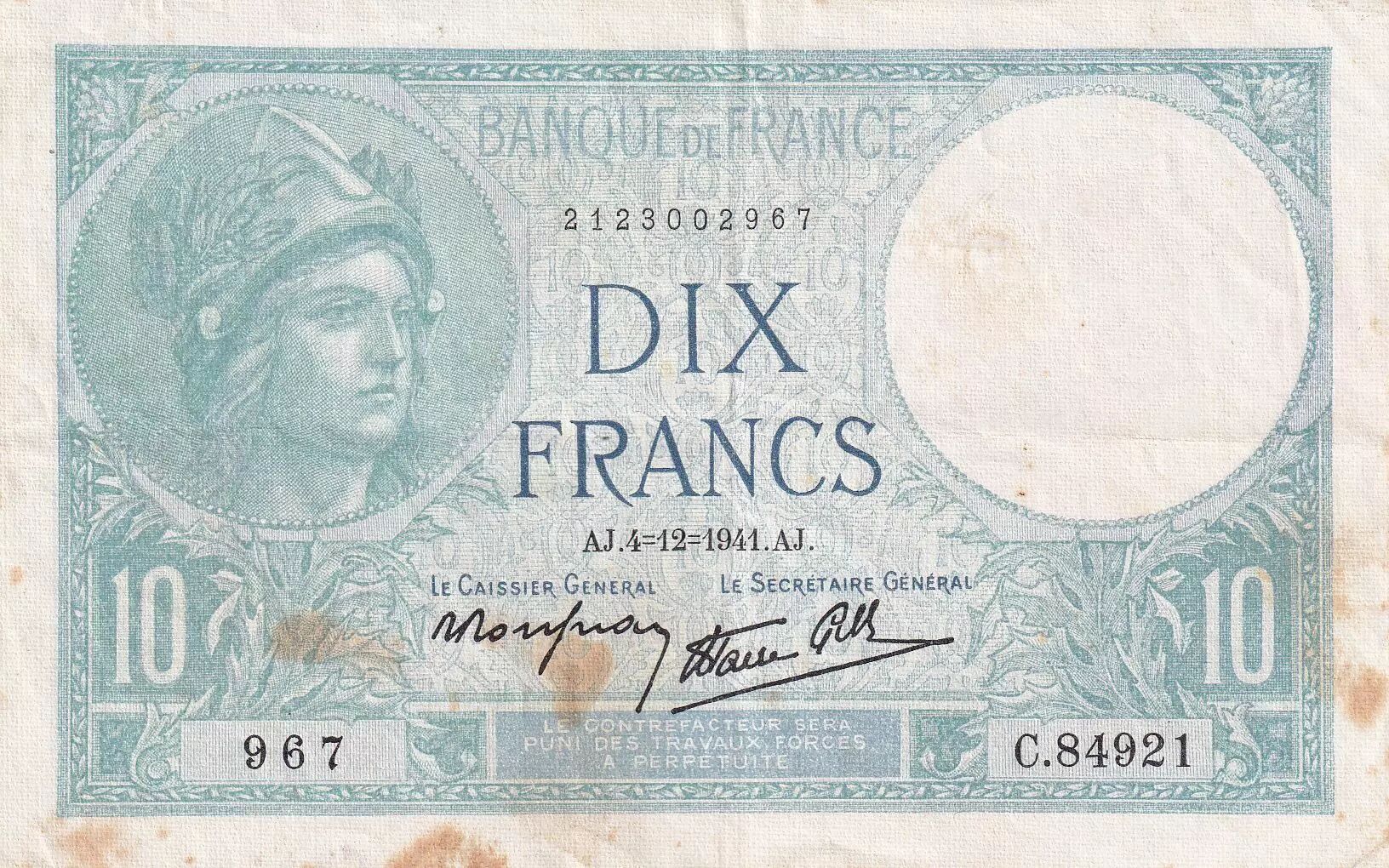 Billet France 10 Francs - Minerve - 04-12-1941 - Série C.84921 - F.07.30