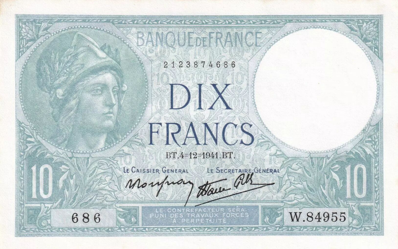 Billet France 10 Francs Minerve - 04-12-1941 - Série W.84955