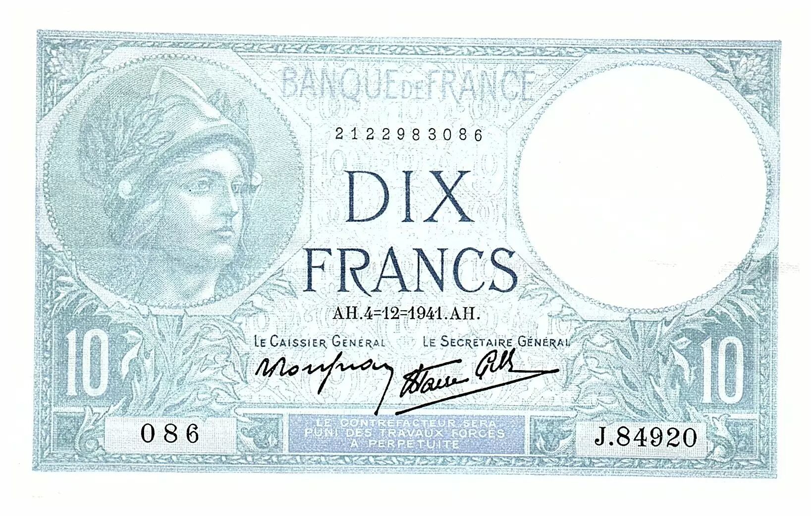 Accueil > Archivage > France 10 Francs - Minerve - 04.12.1941 - Série J.84920 - Fay.07.30