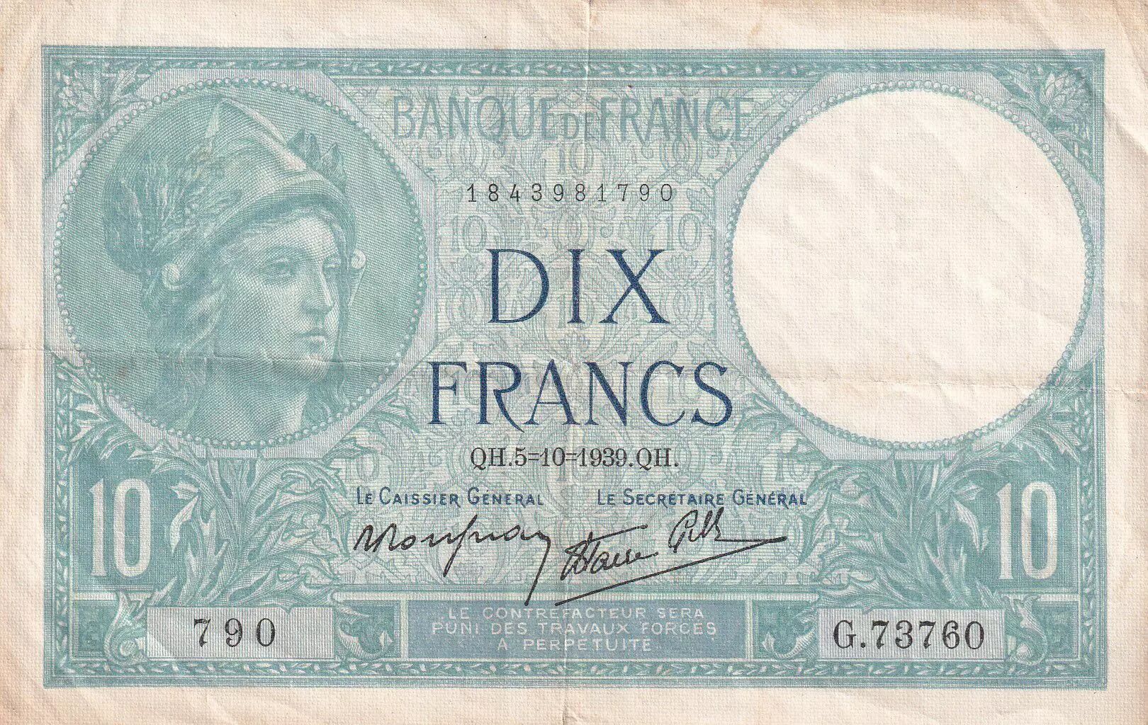 Accueil > Billets Français > Billets Banque de France > Billets 10 Francs > Minerve type 1915 (1916-1942) > France 10 Francs - Minerve - 05-10-1939 - Série G.73760 - F.07.10