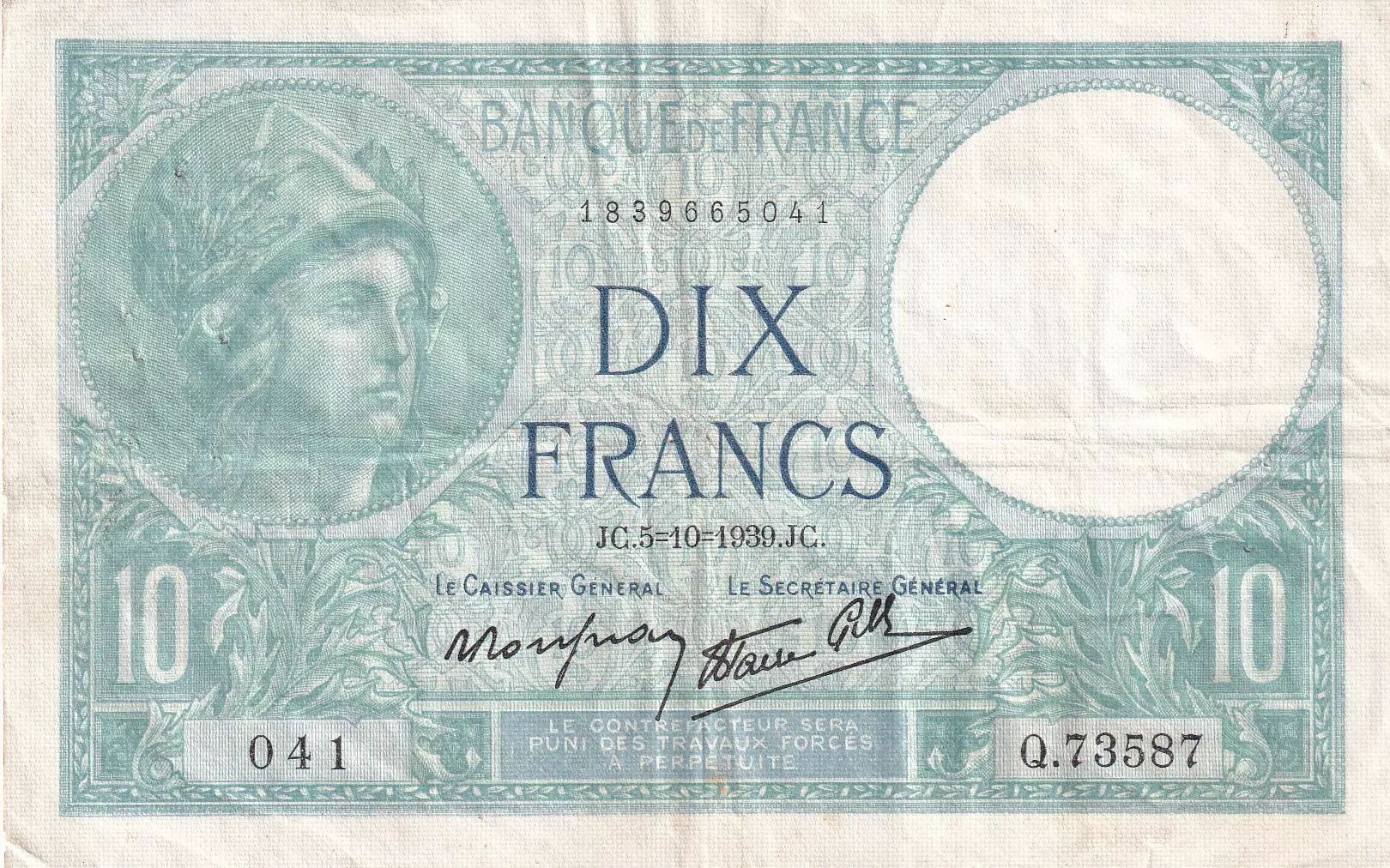 Accueil > Billets Français > Billets Banque de France > Billets 10 Francs > Minerve type 1915 (1916-1942) > France 10 Francs - Minerve - 05-10-1939 - Série Q.73587 - F.07.10