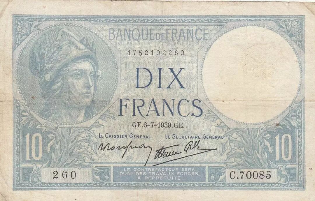 Billet France 10 Francs Minerve - 06-07-1939 - Série C.70085