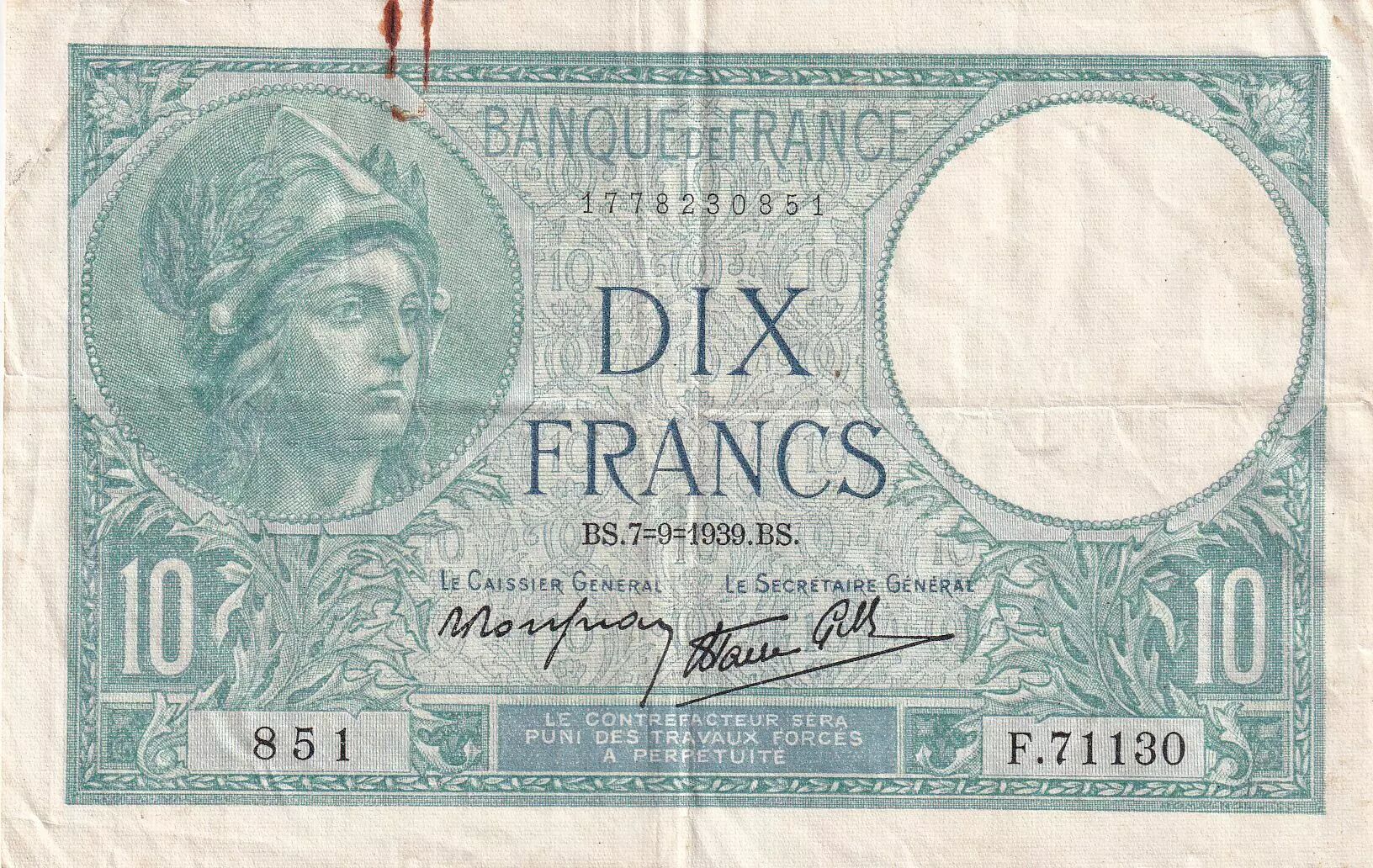 Billet France 10 Francs - Minerve - 07-09-1939 - Série F.71130 - F.07.06