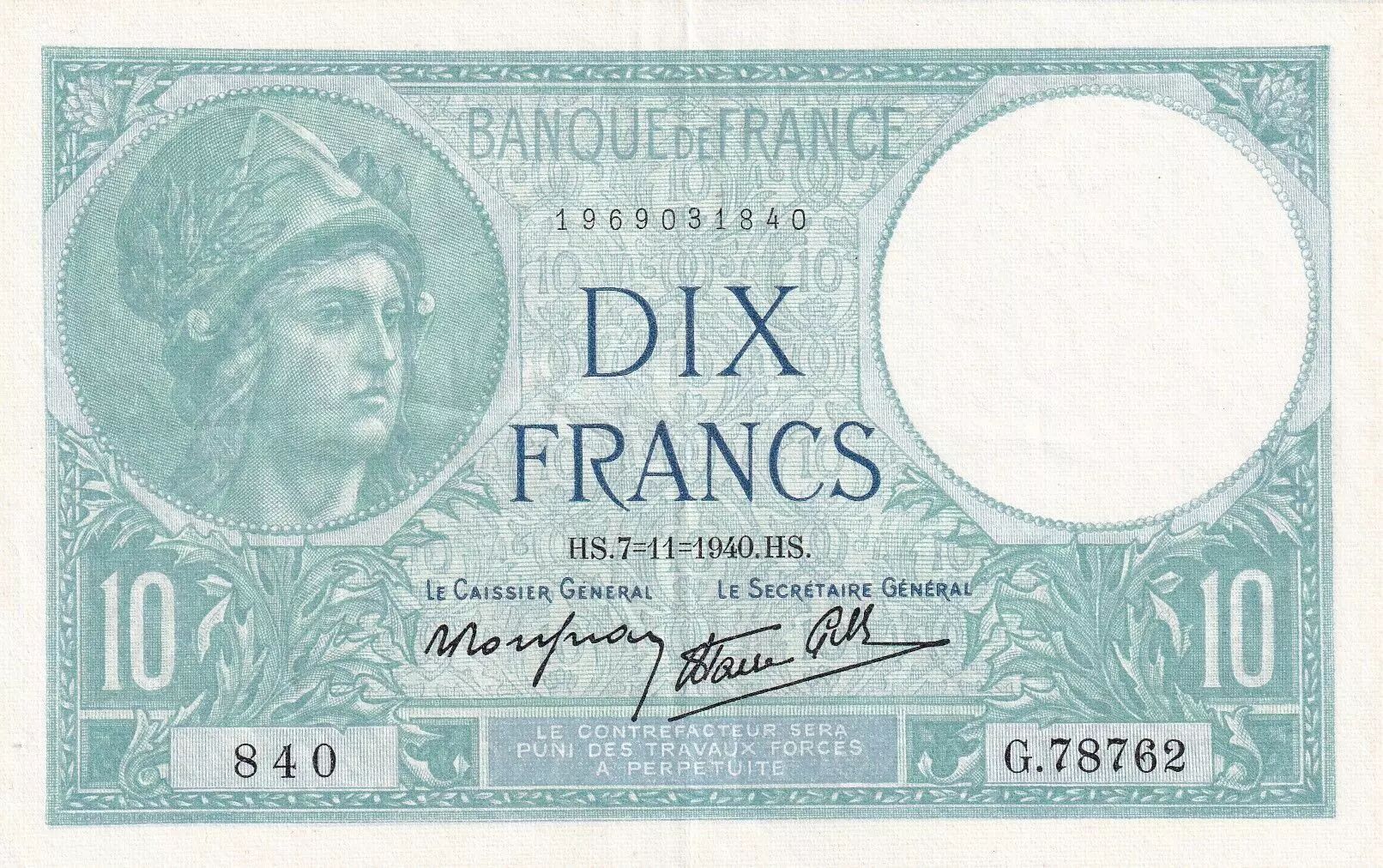 Billet France 10 Francs Minerve - 07-11-1940 - Série G.78762