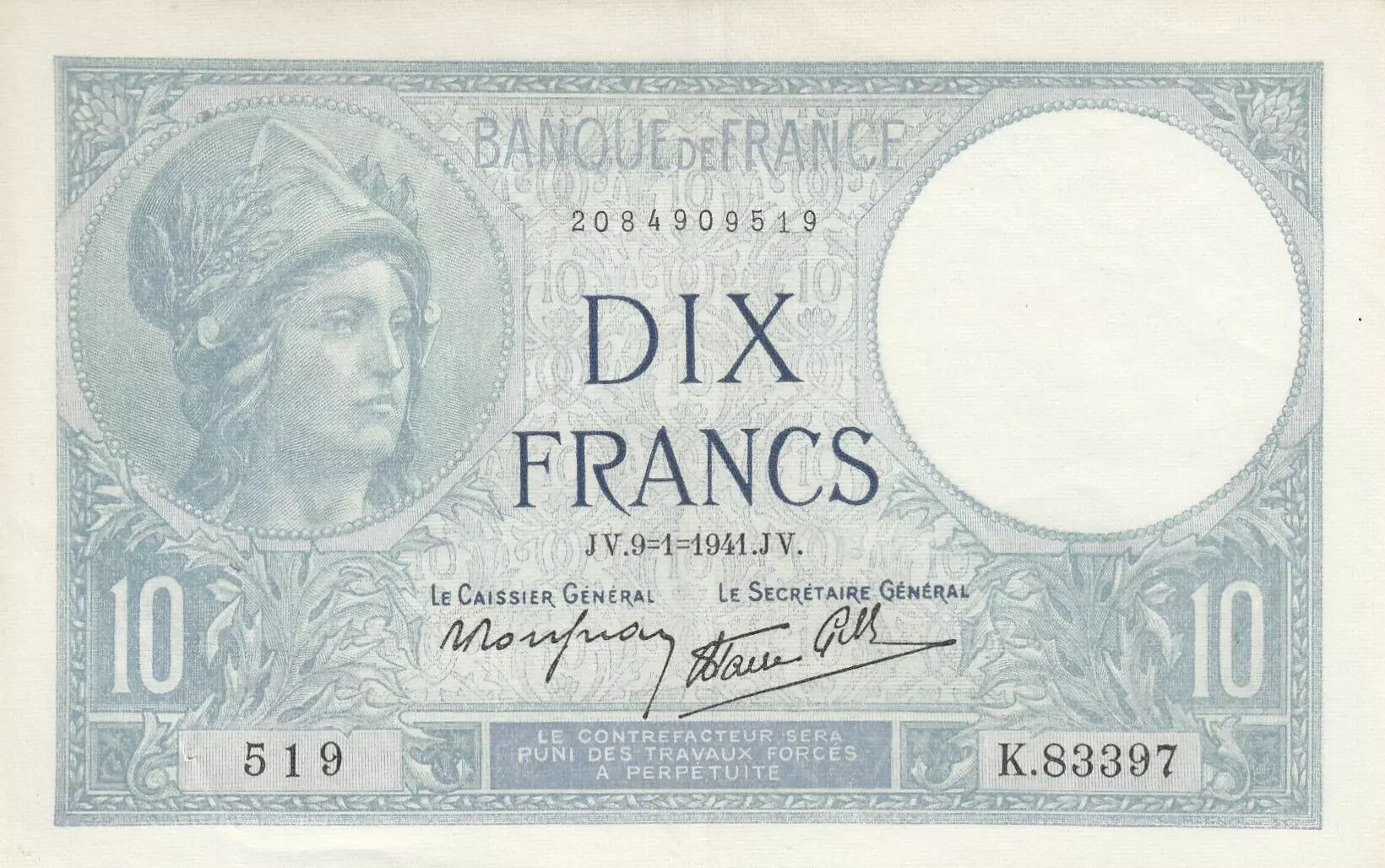 Billet France 10 Francs - Minerve - 09-01-1941 - Série K.83397