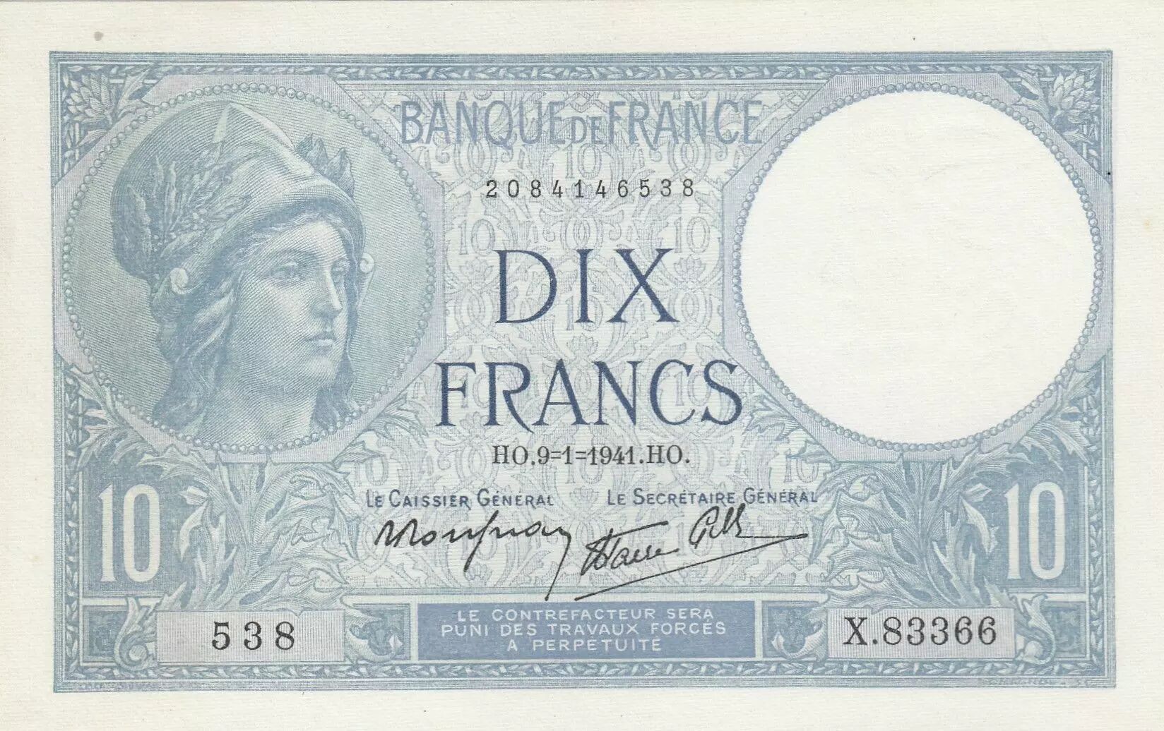 Billet France 10 Francs - Minerve - 09-01-1941 - Série X.83366
