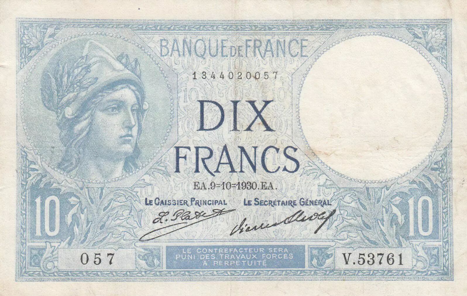 Accueil > Archivage > archivage-Billets Français > France 10 Francs Minerve - 09-10-1930 Série V.53761 - TTB