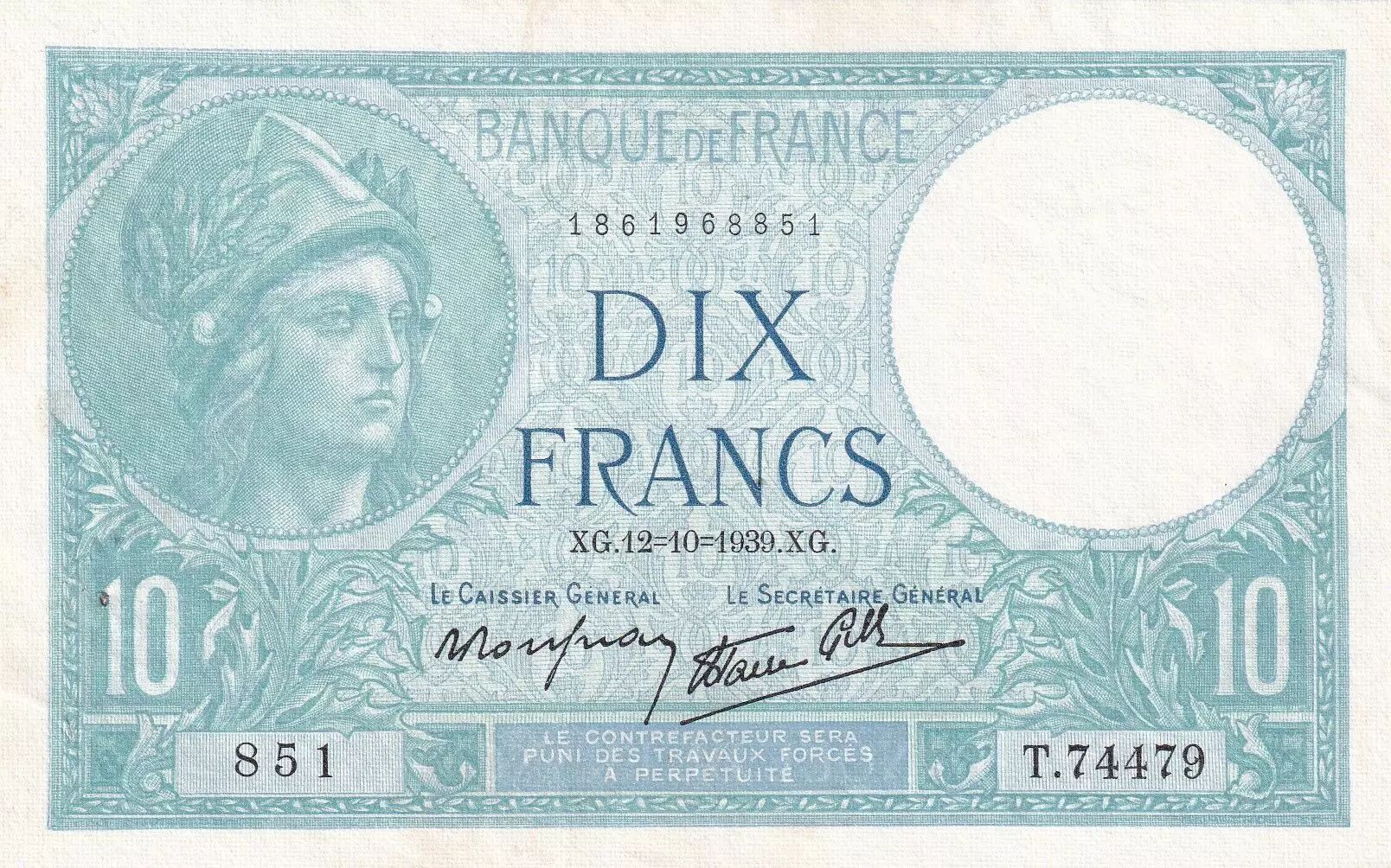 Billet France 10 Francs Minerve - 12-10-1939 - Série T.74479