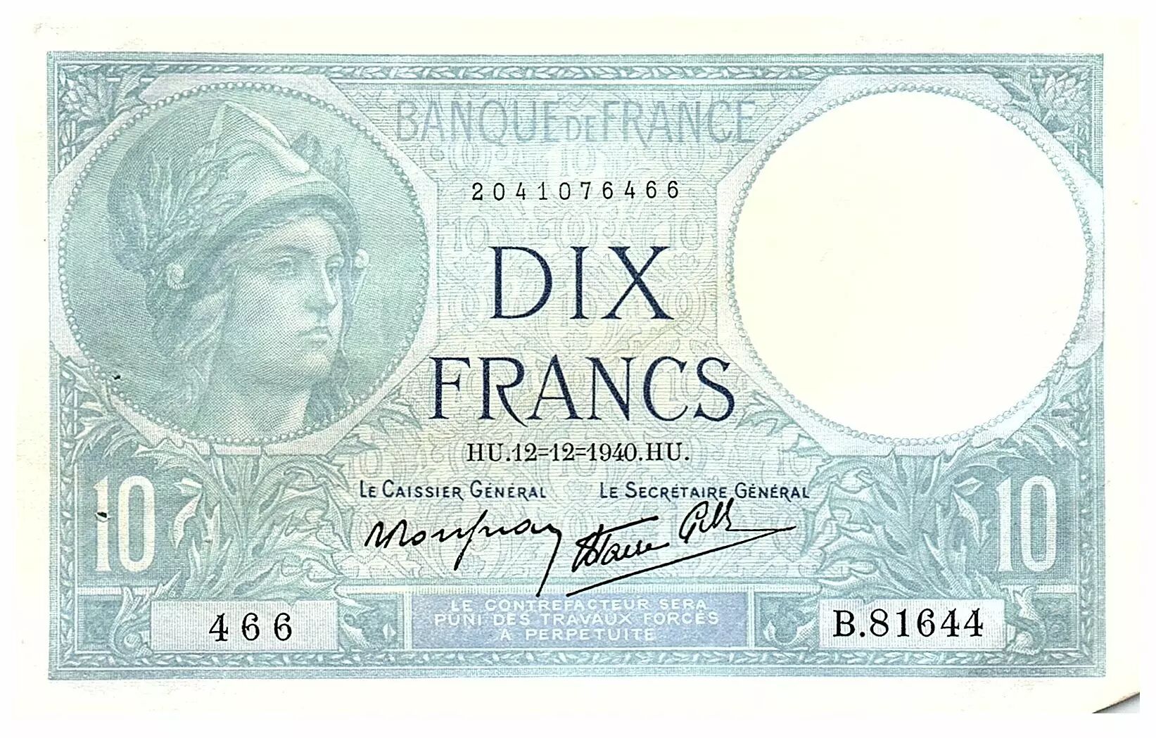 Accueil > Archivage > France 10 Francs - Minerve - 12.12.1940 - Série B.81644 - Fay.7.24