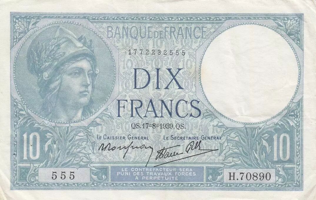 Accueil > Archivage > France 10 Francs Minerve - 17-08-1939 - Série H.70890