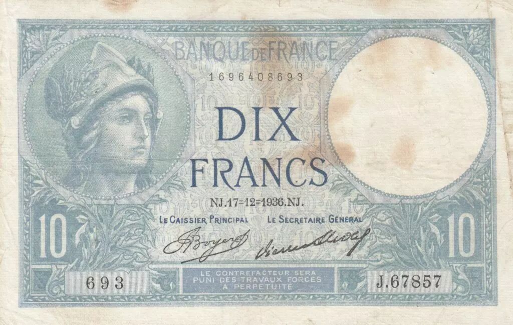 Banknote France 10 Francs Minerve 17-12-1936 - Serial J.67857