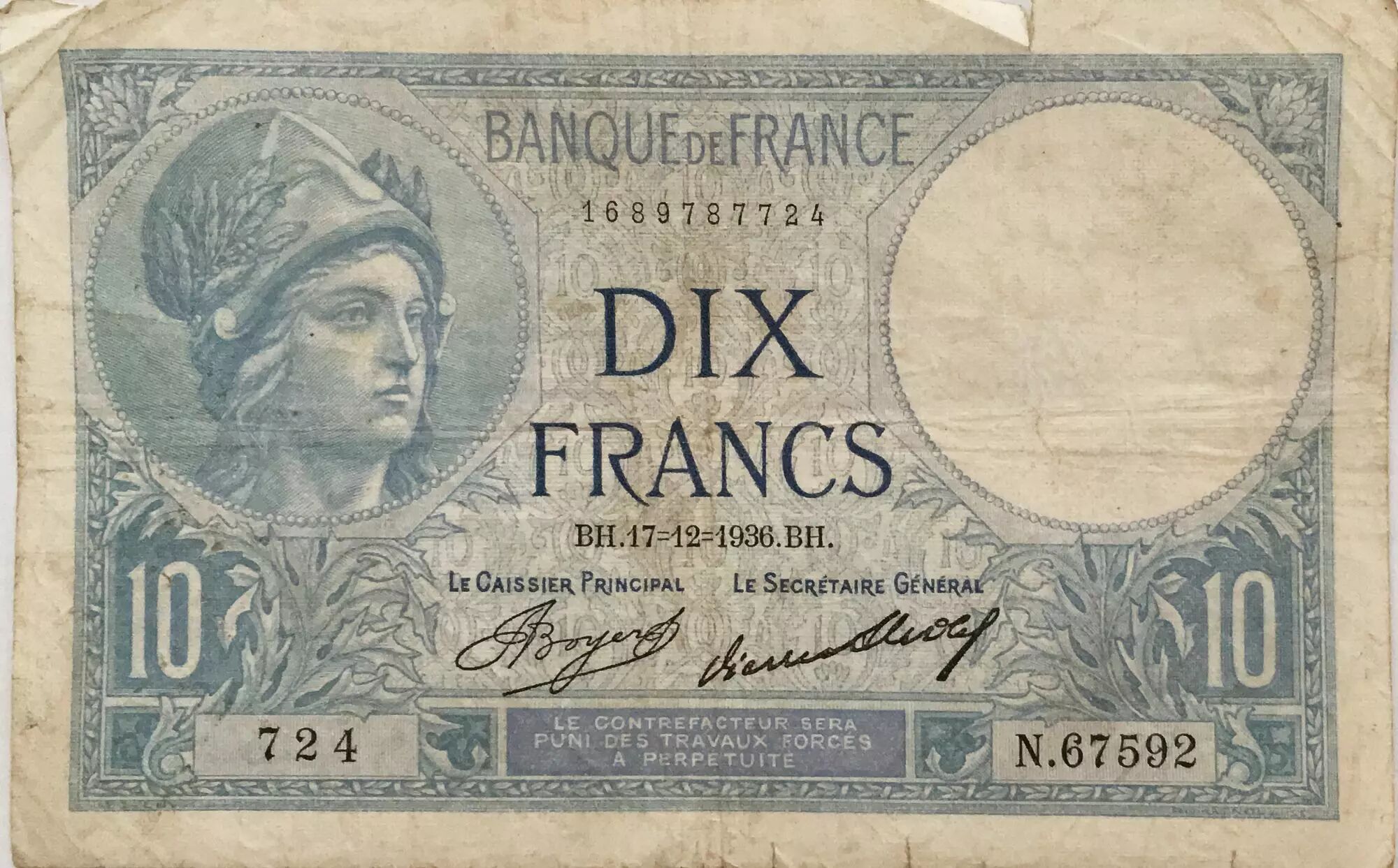 Billet France 10 Francs Minerve 17-12-1936 - Série N.67592 - TB