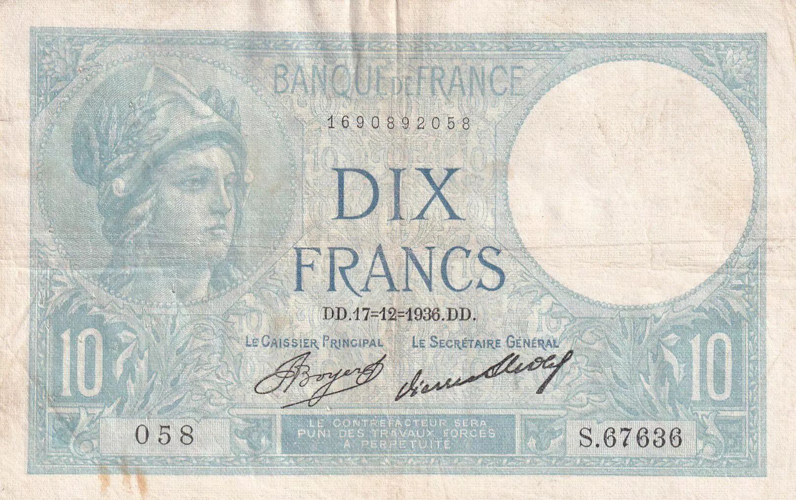 Accueil > Billets Français > Billets Banque de France > Billets 10 Francs > Minerve type 1915 (1916-1942) > France 10 Francs - Minerve - 17-12-1936 - Série S.67636 - F.06.17