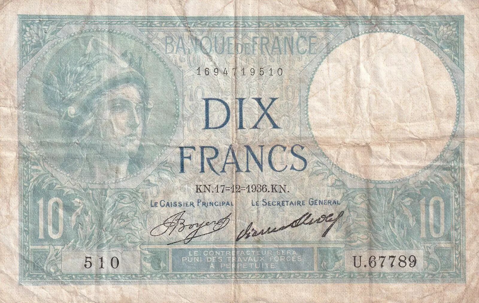 Billet France 10 Francs - Minerve - 17-12-1936 - Série U.67789