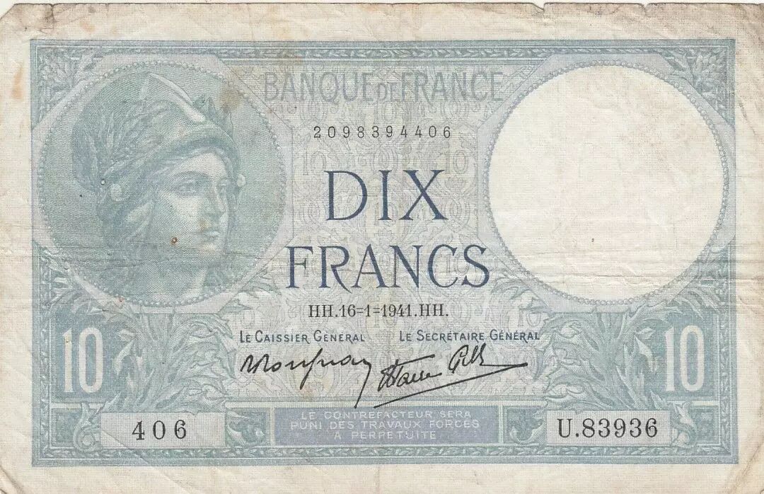 Accueil > Archivage > France 10 Francs Minerve - 19-06-1941 - Série U.83936