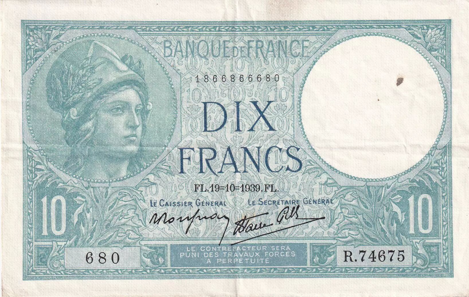 Accueil > Billets Français > Billets Banque de France > Billets 10 Francs > Minerve type 1915 (1916-1942) > France 10 Francs - Minerve - 19-10-1939 - Série R.74675 - F.07.12