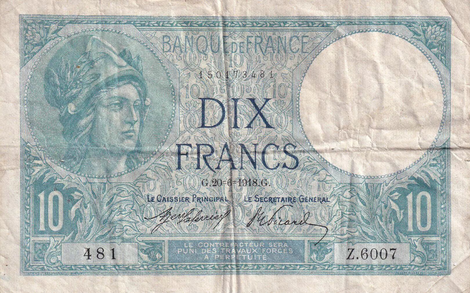 Accueil > Archivage > France 10 Francs - Minerve - 20-06-1918 - Série Z.6007 - TB+ - F.06.03