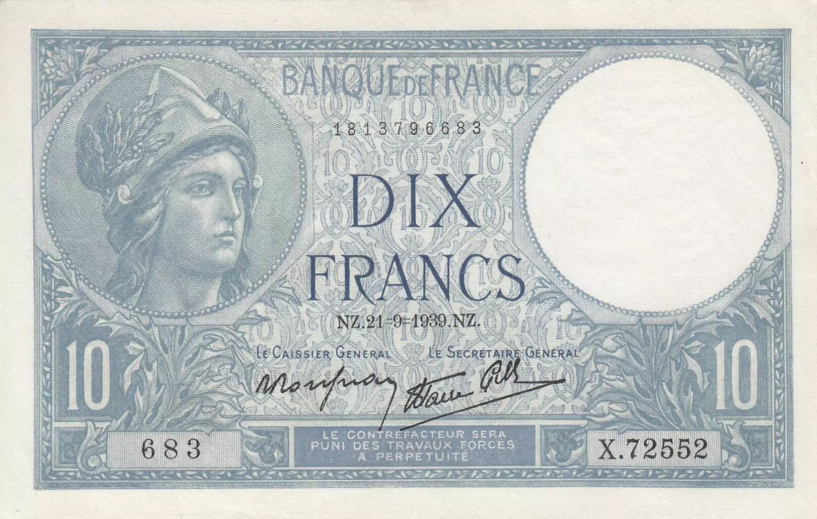 Billet France 10 Francs - Minerve - 21-09-1939 - Série X.72552