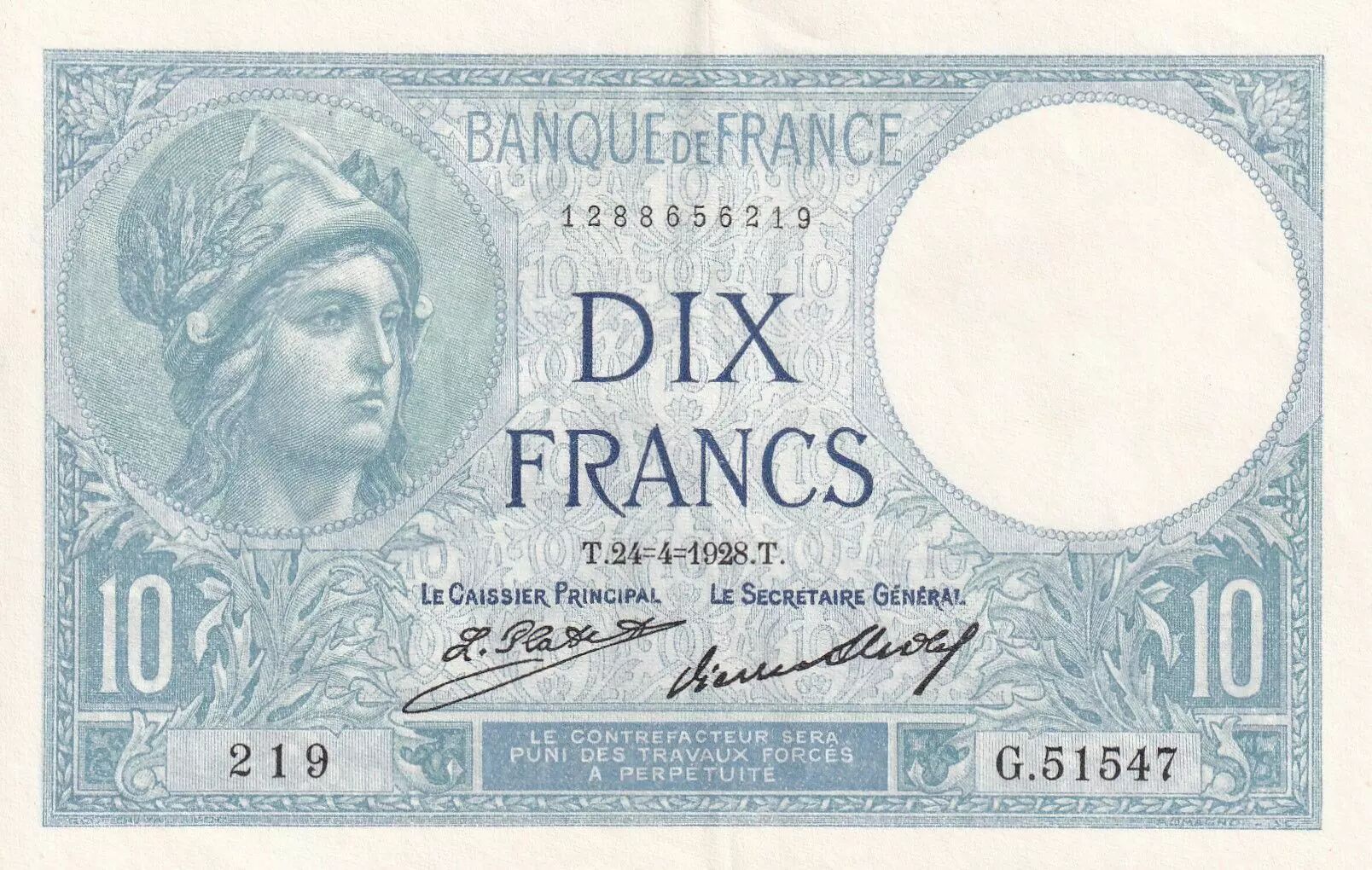 Accueil > Archivage > archivage-Billets Français > France 10 Francs - Minerve - 24-04-1928 - Série G.51547