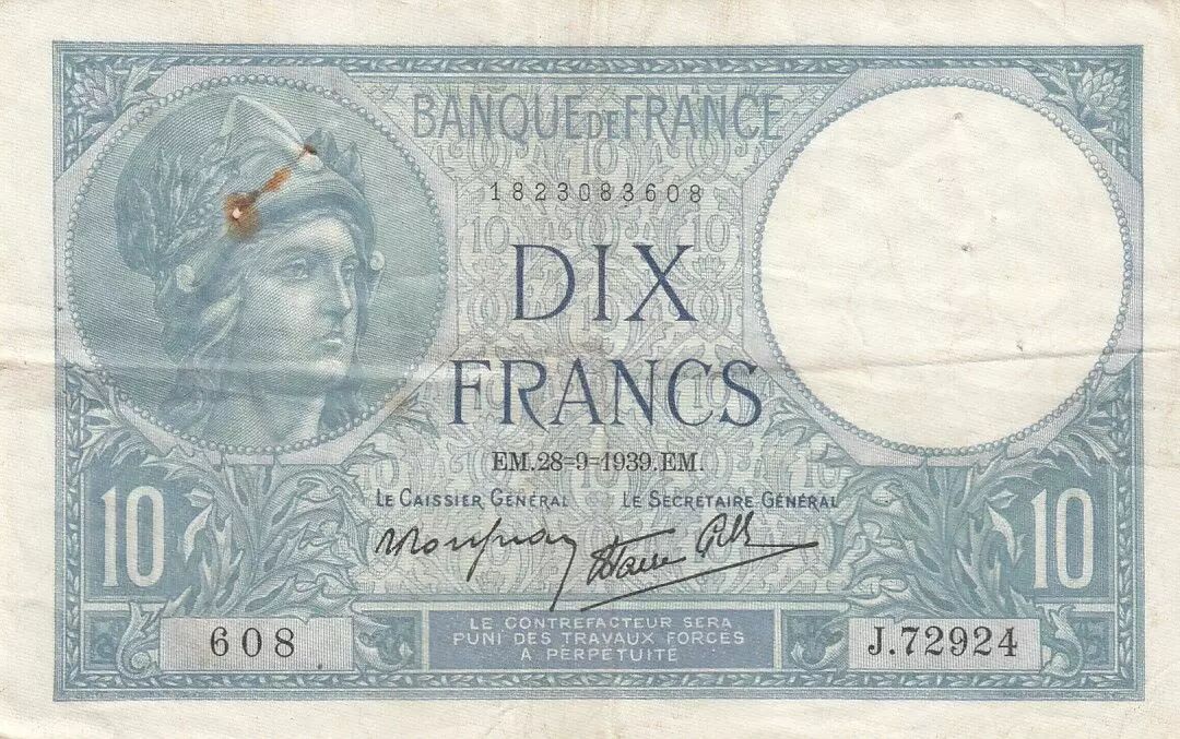 Billet France 10 Francs - Minerve - 28-09-1939 - Série J.72924