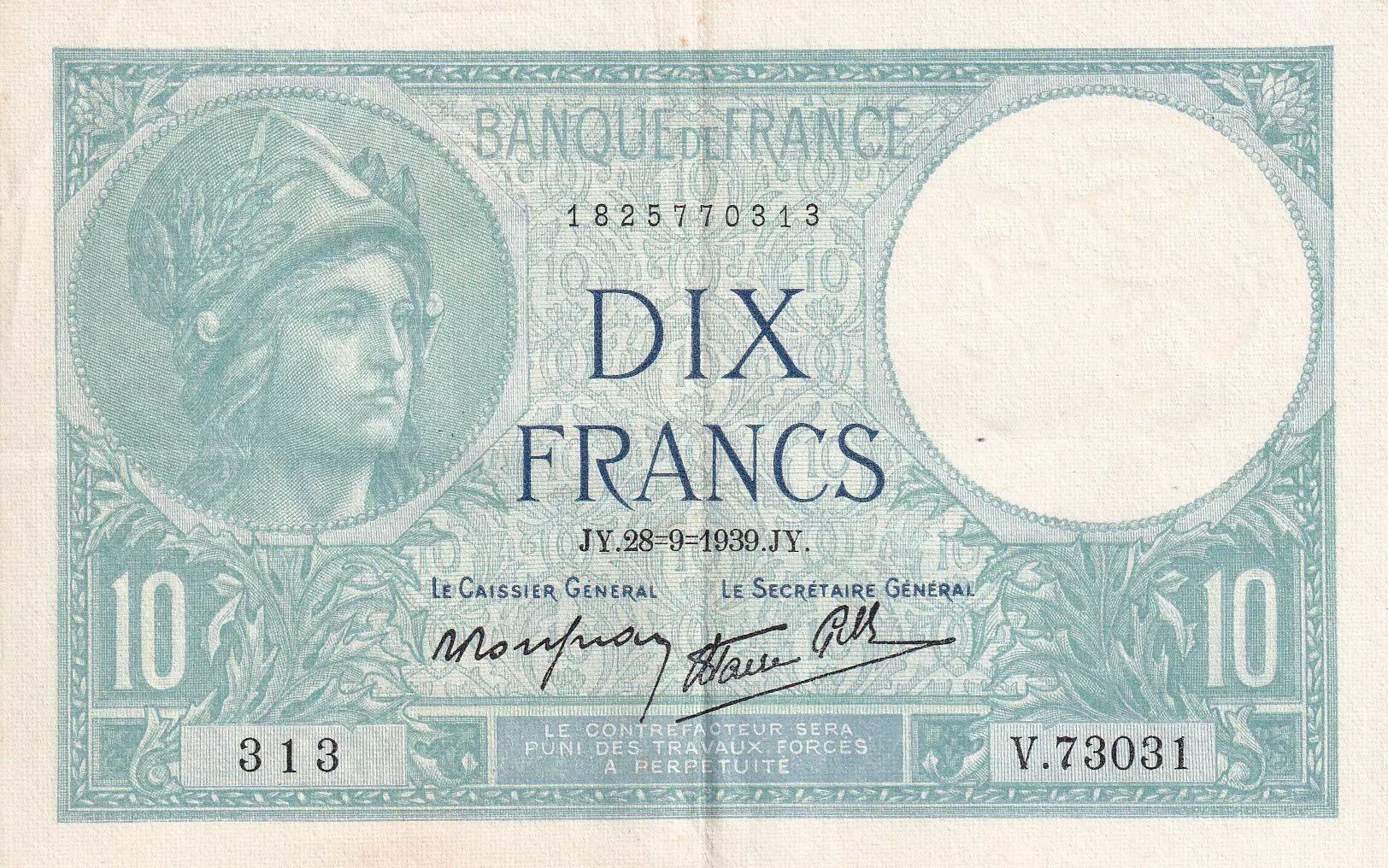 Accueil > Archivage > France 10 Francs - Minerve - 28-09-1939 - Série V.73031 - SUP - F.07.09
