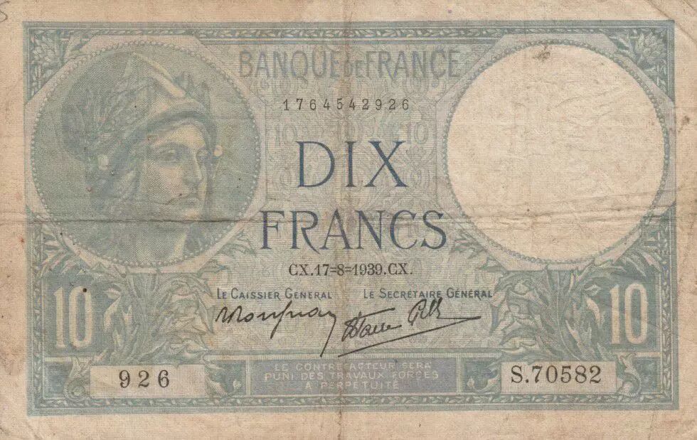 Billet France 10 Francs Minerve - Années variées 1916-1942 - TB