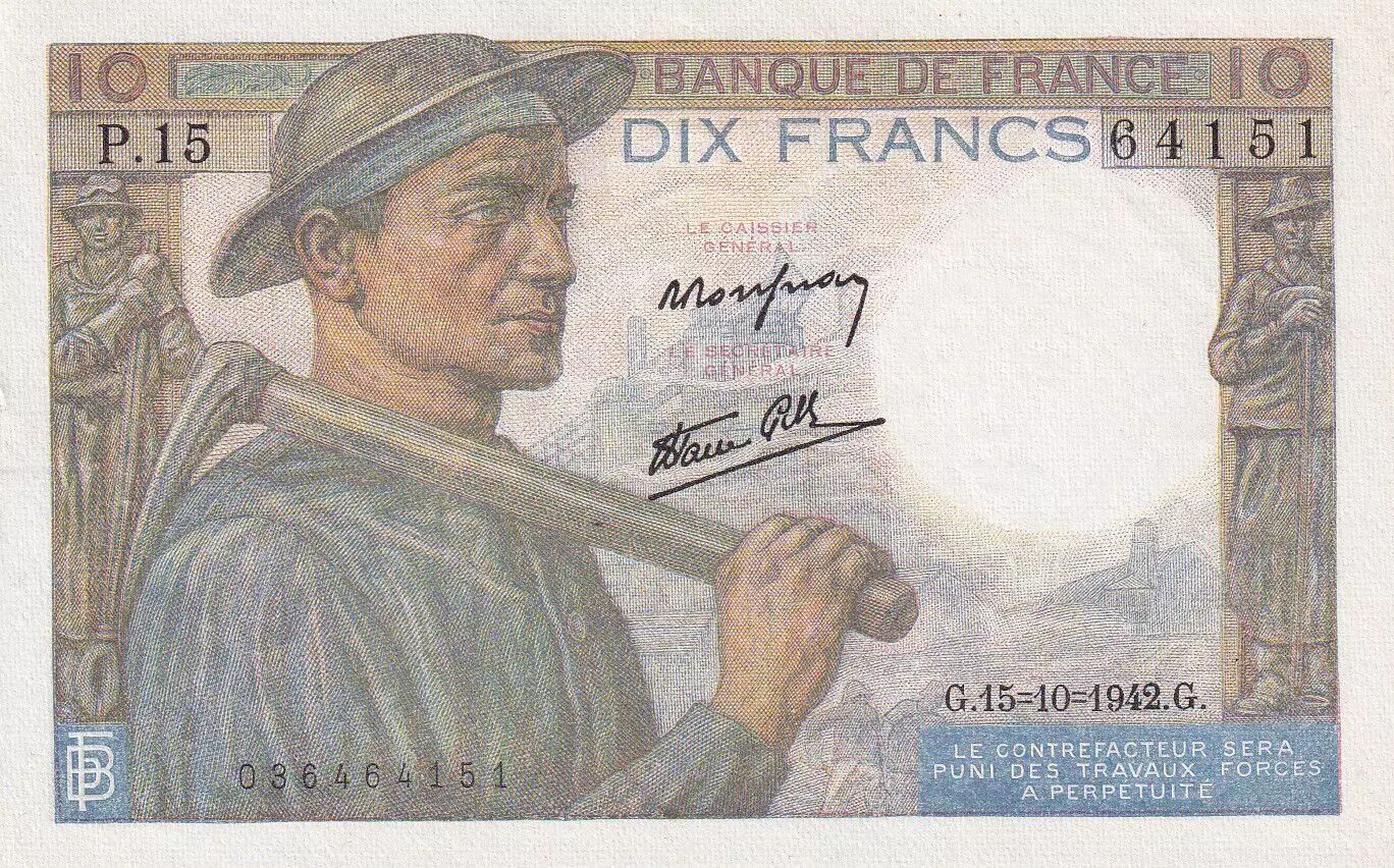 Billet France 10 Francs - Mineur - 15-10-1942 - Série P.15 - F.08.04