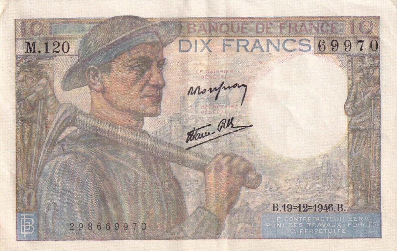 Ce billet de banque français, d'une valeur nominale de 10 francs, a été émis le 19 décembre 1946. Il appartient à la série M.120.