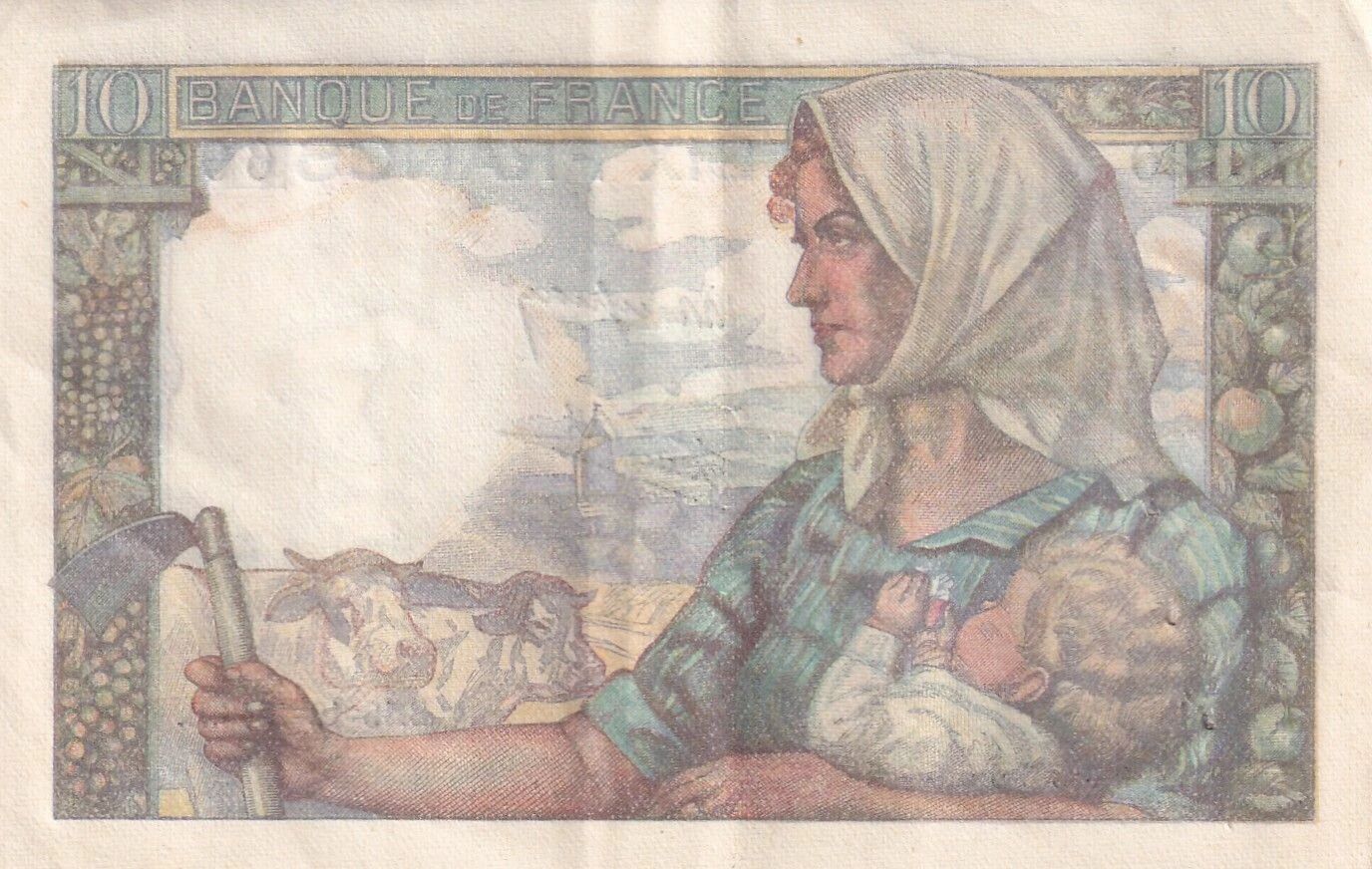 Le verso du billet met en scène une jeune paysanne portant son enfant, avec un paysage agricole en arrière-plan. La silhouette du hameau représenté est inspirée du village de Bazouges, situé dans la Sarthe. L'écriture utilisée sur le billet est latine.