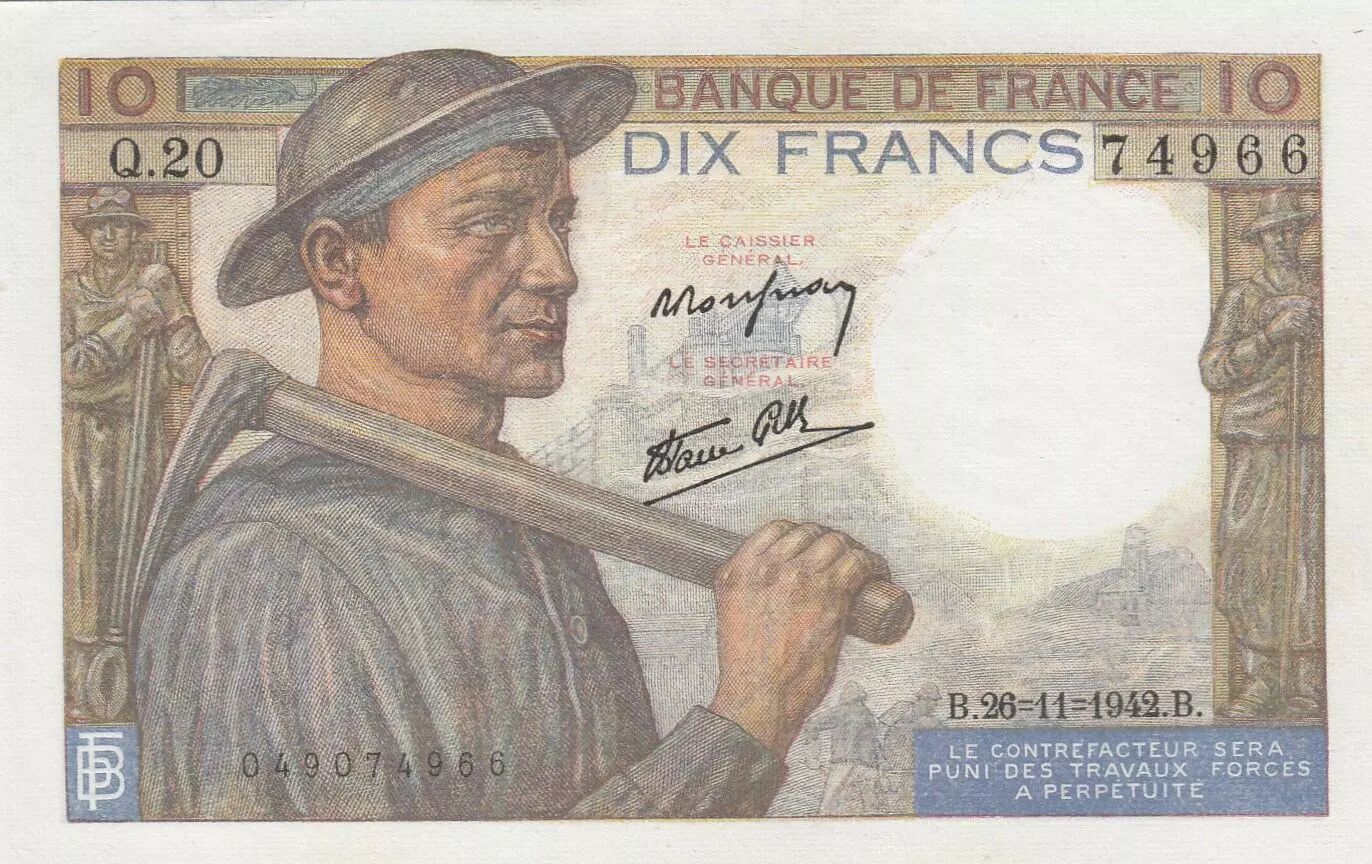 Ce billet de banque français a une valeur nominale de 10 francs. Il a été émis en 1942. Le billet fait partie d'une série identifiée par le code "Q.20". Il est classifié comme un billet de type "Mineur".