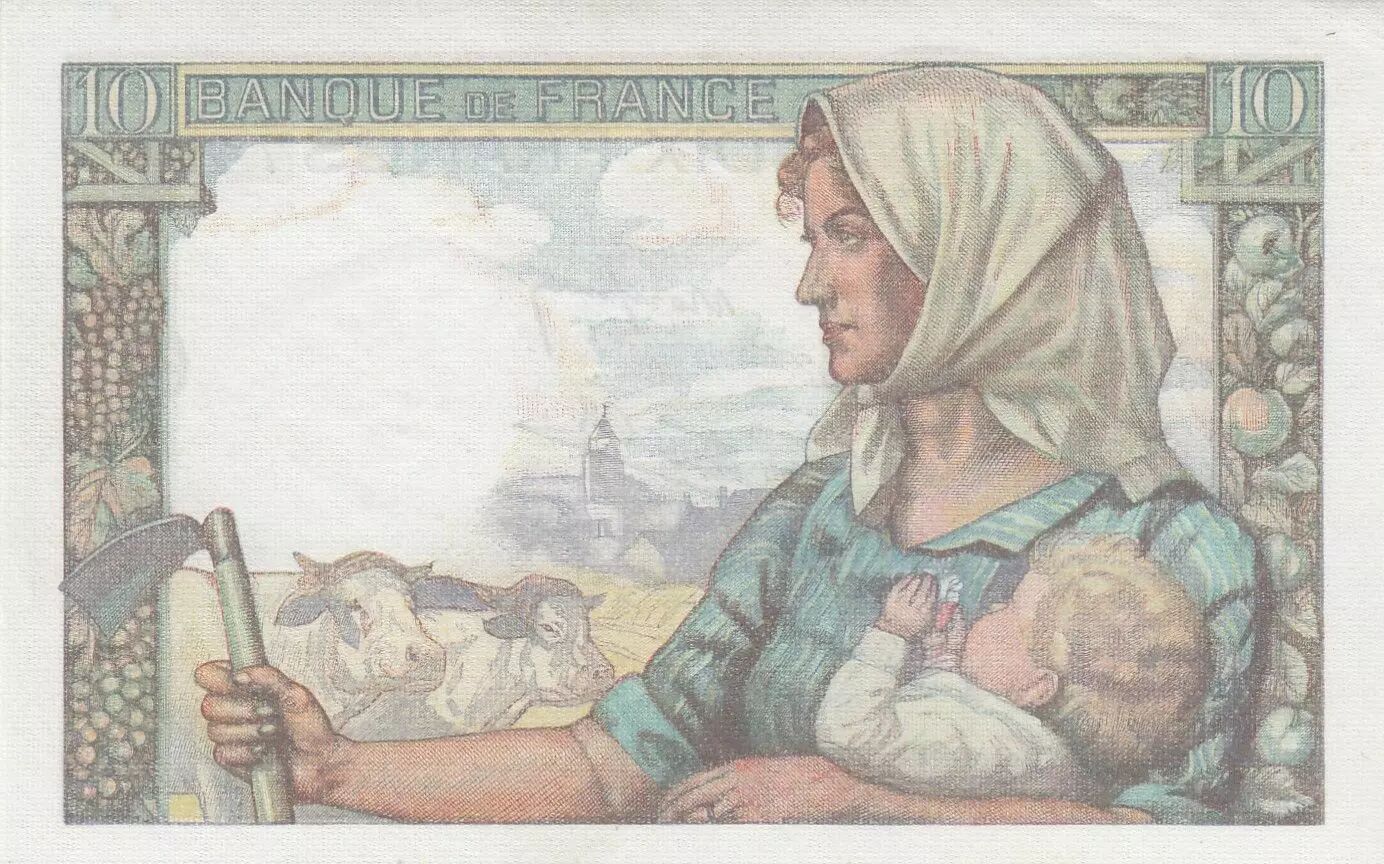 Ce billet de 10 francs, émis en 1942, témoigne du contexte économique et social de la France pendant la Seconde Guerre mondiale. Il représente une part de l'histoire monétaire du pays, avec des caractéristiques graphiques et techniques propres à cette période spécifique.