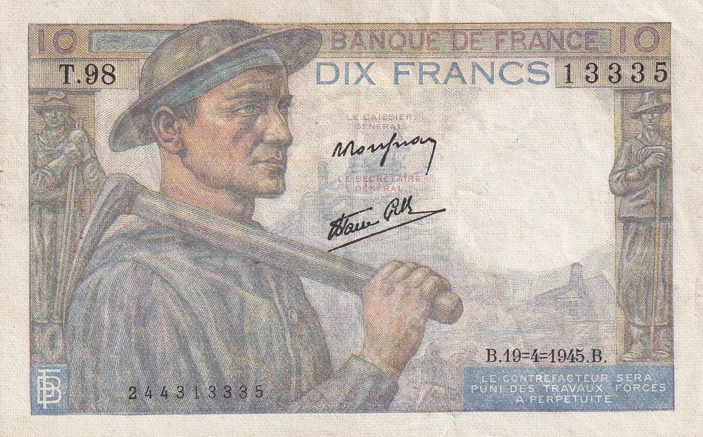 Home > French Banknotes > Bank of France Banknotes > 10 Francs > Miner Type 1941 (1941-1949) > France 10 Francs - Minor - 19-04-1945 - Serial T.98 - P.99