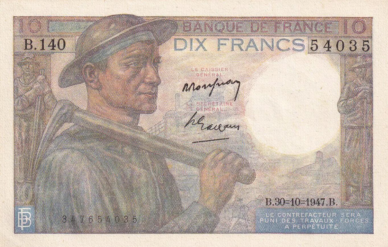 Home > French Banknotes > Bank of France Banknotes > 10 Francs > Miner Type 1941 (1941-1949) > France 10 Francs - Minor - 30-01-1947 - Serial B.140-54035 - P.99