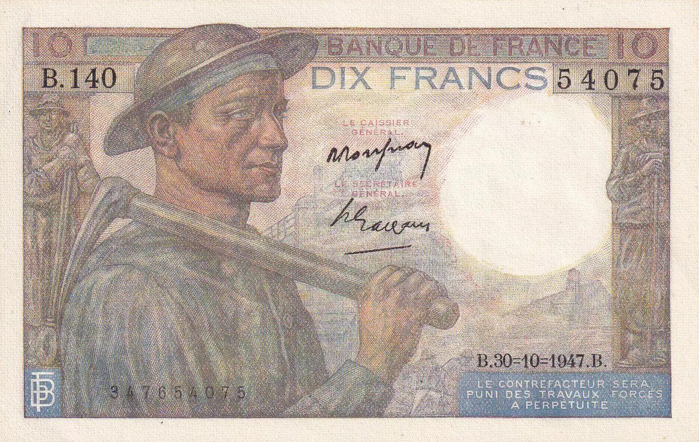Home > French Banknotes > Bank of France Banknotes > 10 Francs > Miner Type 1941 (1941-1949) > France 10 Francs - Minor - 30-01-1947 - Serial B.140 - P.99