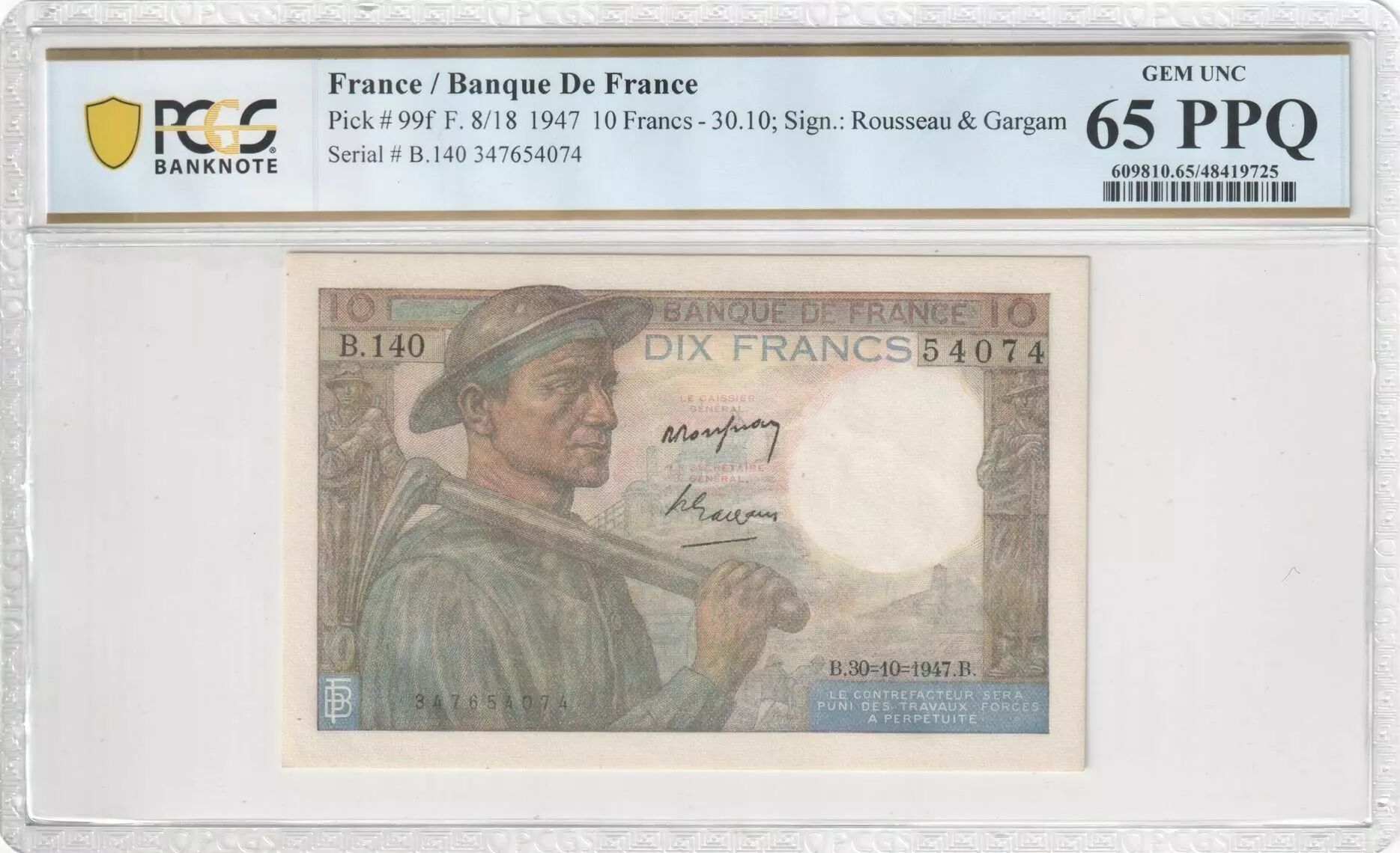 Home > French Banknotes > Bank of France Banknotes > 10 Francs > Miner Type 1941 (1941-1949) > France 10 Francs - Minor - 30-01-1947 - Serial B.140 - PCGS 65 PPQ