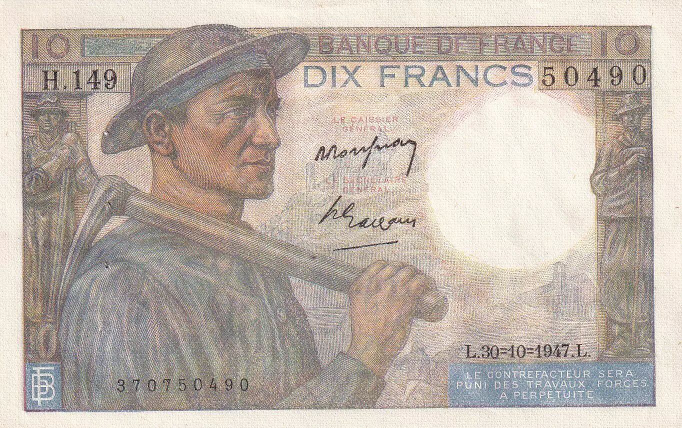 Home > French Banknotes > Bank of France Banknotes > 10 Francs > Miner Type 1941 (1941-1949) > France 10 Francs - Minor - 30-10-1947 - Serial H.149 - P.99