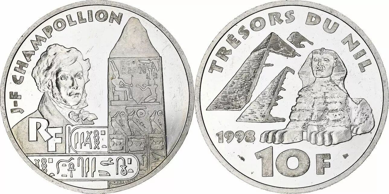 Pièce France 10 Francs Trésor du Nil : Champollion - 1998 - Argent - Avec boite et certificat - Frappe BE