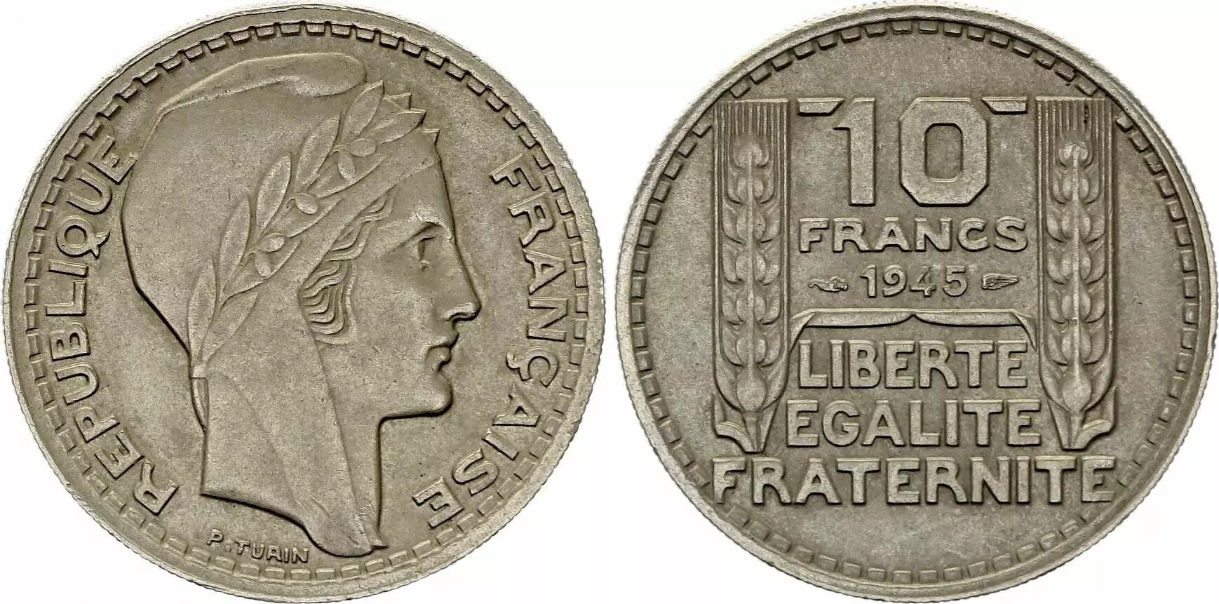 Le revers de la pièce représente deux épis de blé encadrant la valeur faciale "10 FRANCS". La devise française "LIBERTE EGALITE FRATERNITE" est inscrite en dessous. L'année d'émission, 1945, figure également sur cette face. Comme sur l'avers, la signature du graveur Pierre Turin est présente.