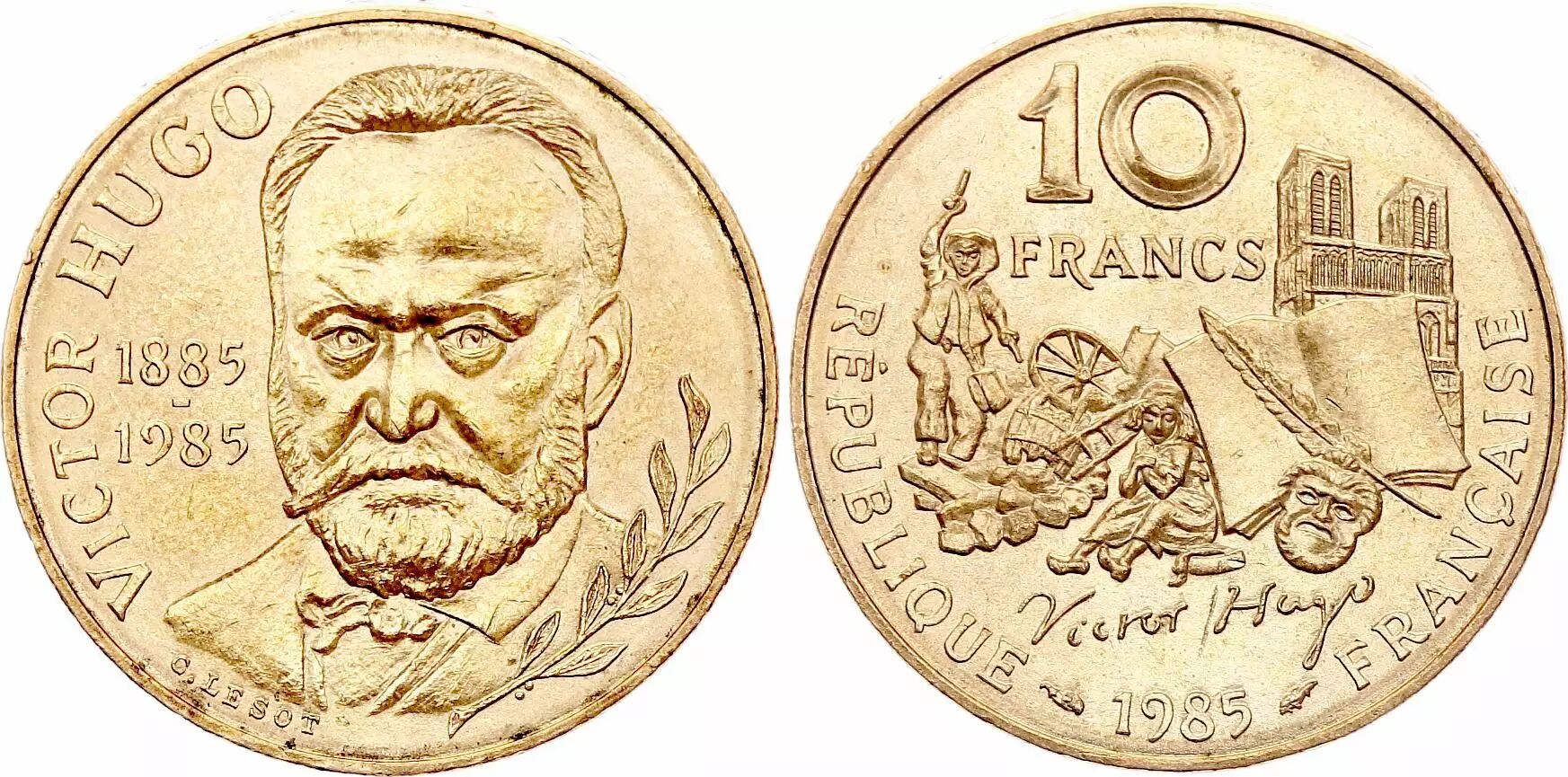 The 10 Francs Victor Hugo coin, minted in 1985, is a French commemorative coin issued to mark the centenary of the death of the writer Victor Hugo (1802-1885). It has a face value of 10 francs.