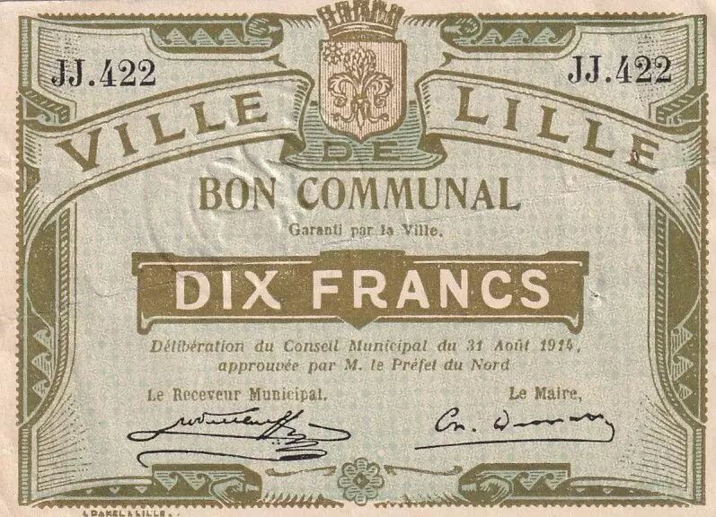 Ce billet de 10 francs est un bon communal émis par la ville de Lille, daté du 31 août 1914, et porte le numéro de série JJ 422. Il s'agit d'une émission spécifique de la ville, mise en circulation dans un contexte particulier lié aux événements de la Première Guerre mondiale.