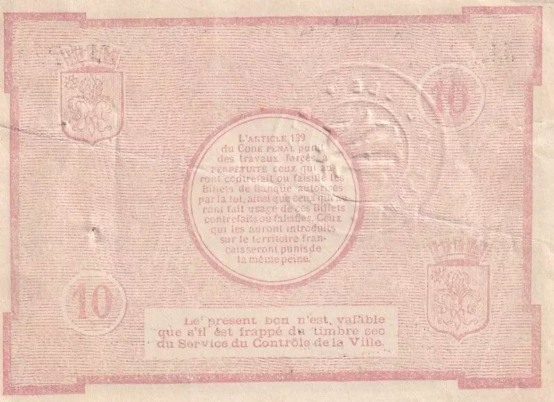 Le revers du billet contient un avertissement légal important, citant l'article 139 du Code pénal, qui stipule les peines encourues pour la contrefaçon ou la falsification de billets de banque, ainsi que pour leur utilisation ou introduction sur le territoire français. La peine mentionnée est celle des travaux forcés à perpétuité. De plus, il est précisé que le billet n'est valable que s'il est frappé du timbre sec du Service du Contrôle de la Ville. Le nom de l'imprimeur, Imprimerie L. Danel, Lille, France, est également répété au verso.