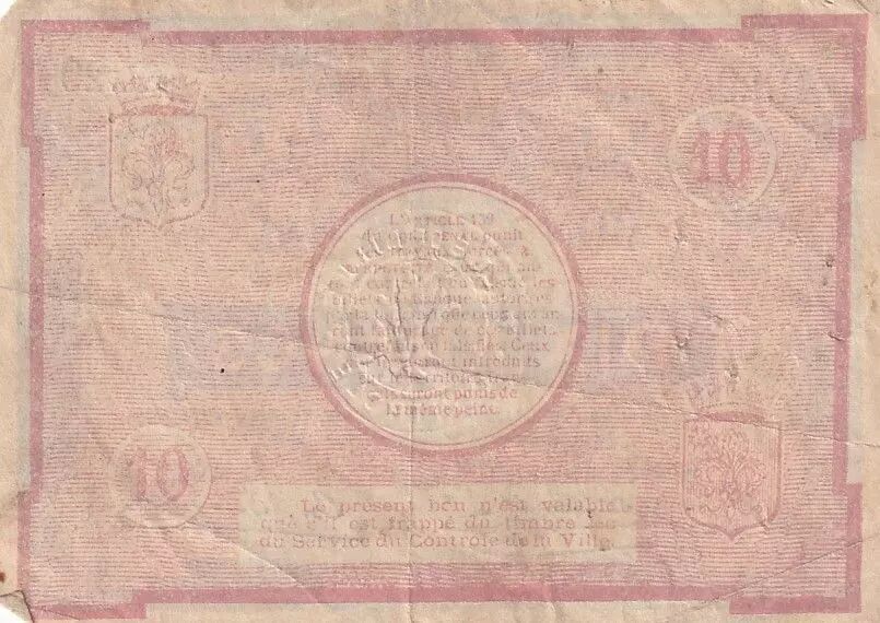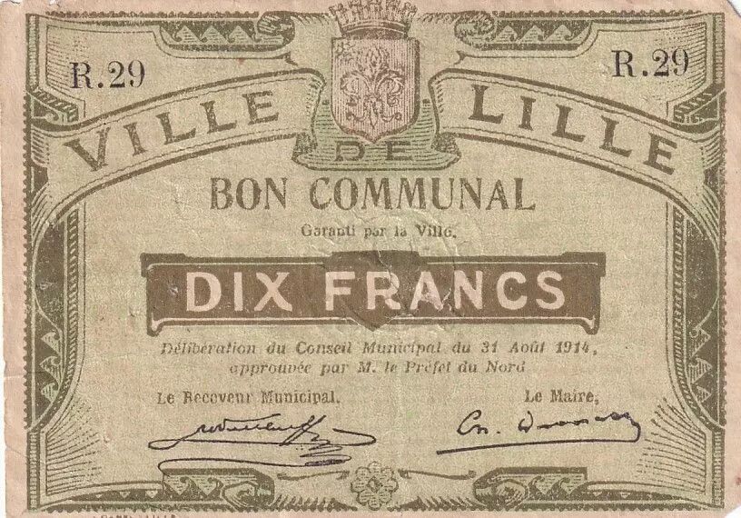Ce billet de 10 francs est un bon communal émis par la ville de Lille, daté du 31 août 1914, et faisant partie de la série R 29. Il s'agit d'une émission locale mise en place dans un contexte particulier, probablement lié aux circonstances de la Première Guerre Mondiale.