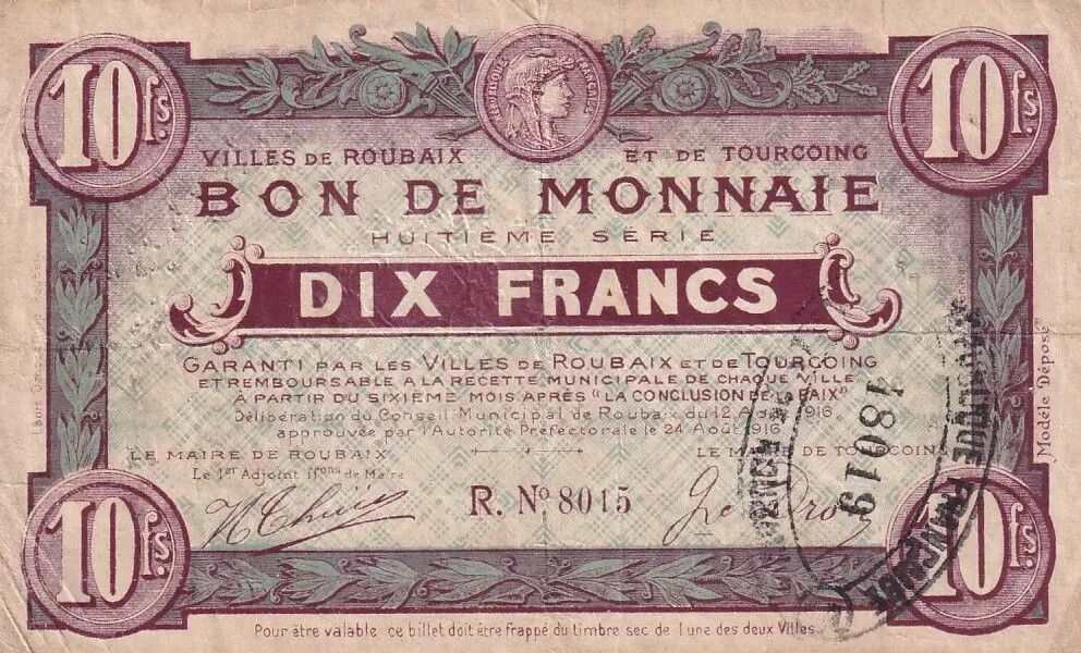 Le billet de 10 francs de Roubaix-Tourcoing, émis le 12 août 1916, appartient à la huitième série référencée R8015. Ce bon de monnaie a été émis par les villes de Roubaix et de Tourcoing.