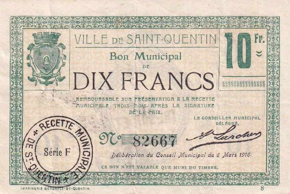 Ce billet de 10 francs est un bon municipal émis par la ville de Saint-Quentin le 6 mars 1916, durant la Première Guerre mondiale. Il appartient à la Série F et porte le numéro 82667.
