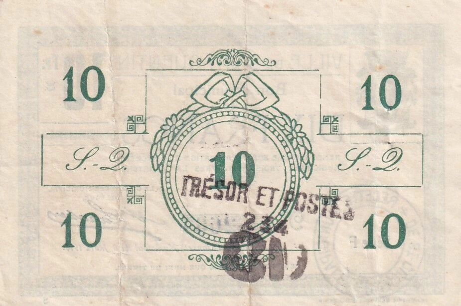 Le revers du billet arbore un design décoratif vert et symétrique. La valeur faciale "10" est répétée dans les coins. Les initiales "S.Q.", probablement pour Saint-Quentin, sont discrètement intégrées au motif. Un grand médaillon central affiche le chiffre "10" entouré d'une couronne de feuillage. Un cachet supplémentaire en noir, portant la mention "TRÉSOR ET POSTES", indique une validation administrative du bon.