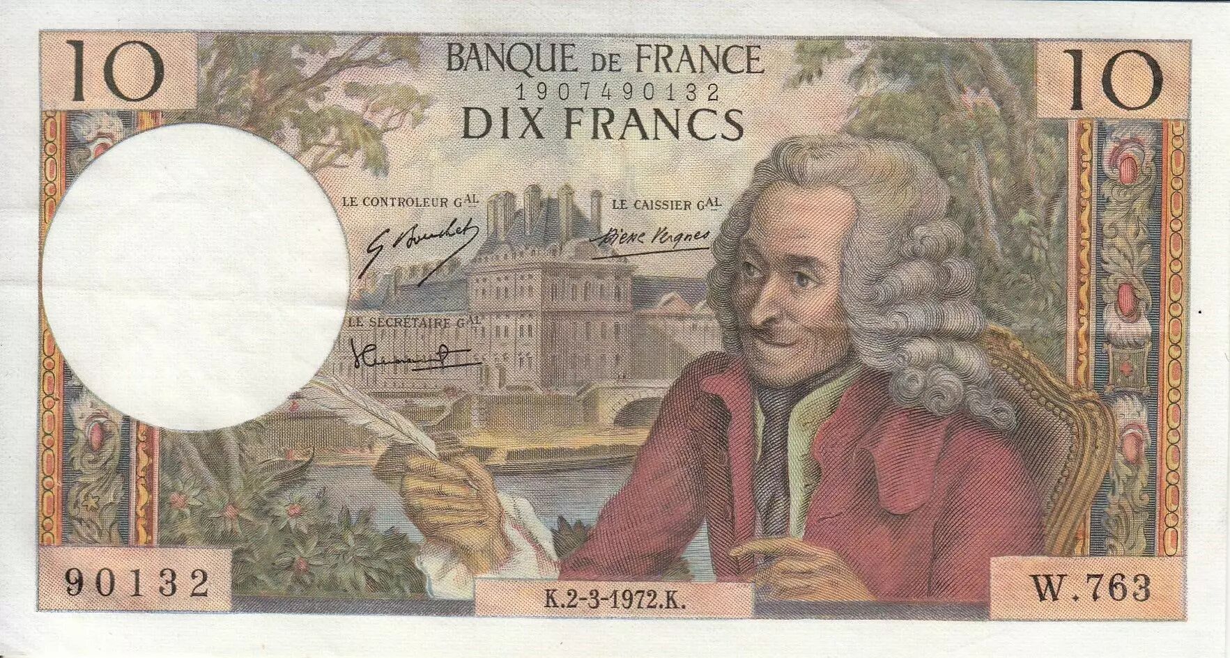 This French banknote has a face value of 10 francs. It was issued in 1972.