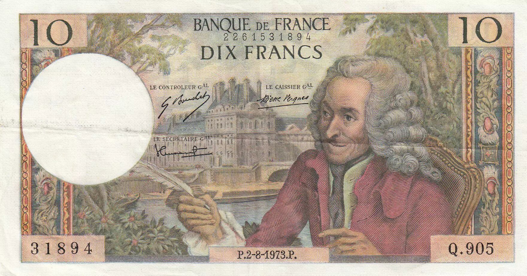 Accueil > Archivage > France 10 Francs Voltaire - 02-08-1973 Série Q.905