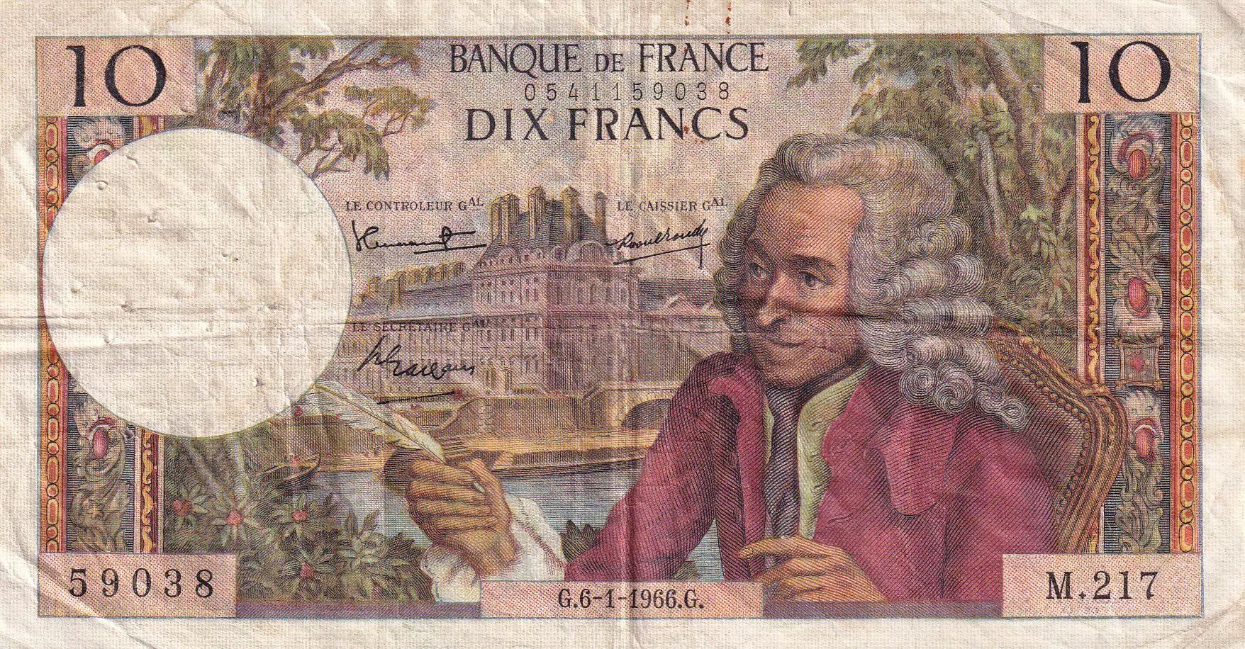 Banknote France 10 Francs - Voltaire - 06-01-1966 - Serial M.217 - P.147