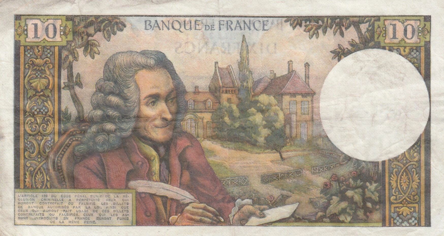 Voici une fiche numismatique pour le billet de 10 Francs Voltaire :